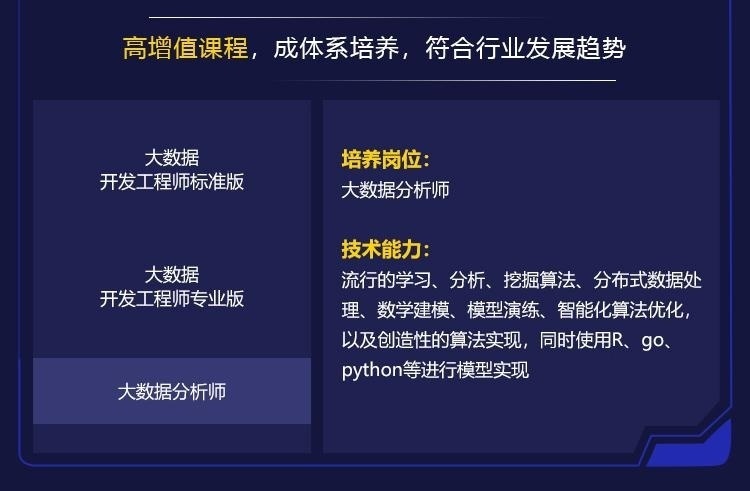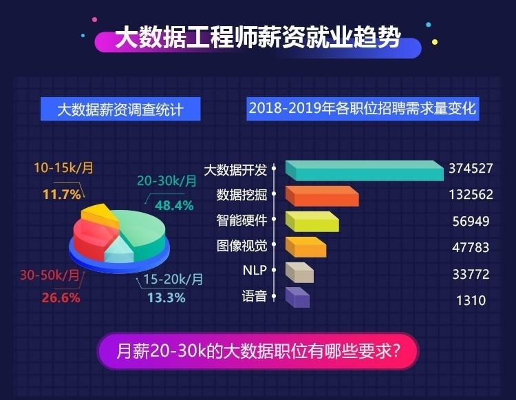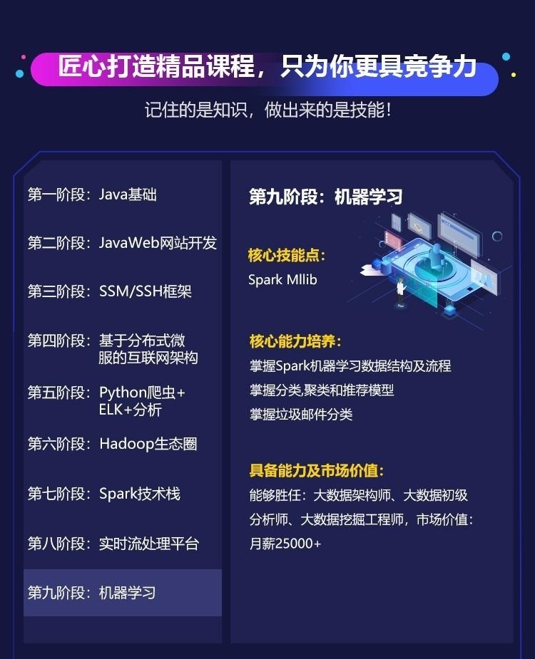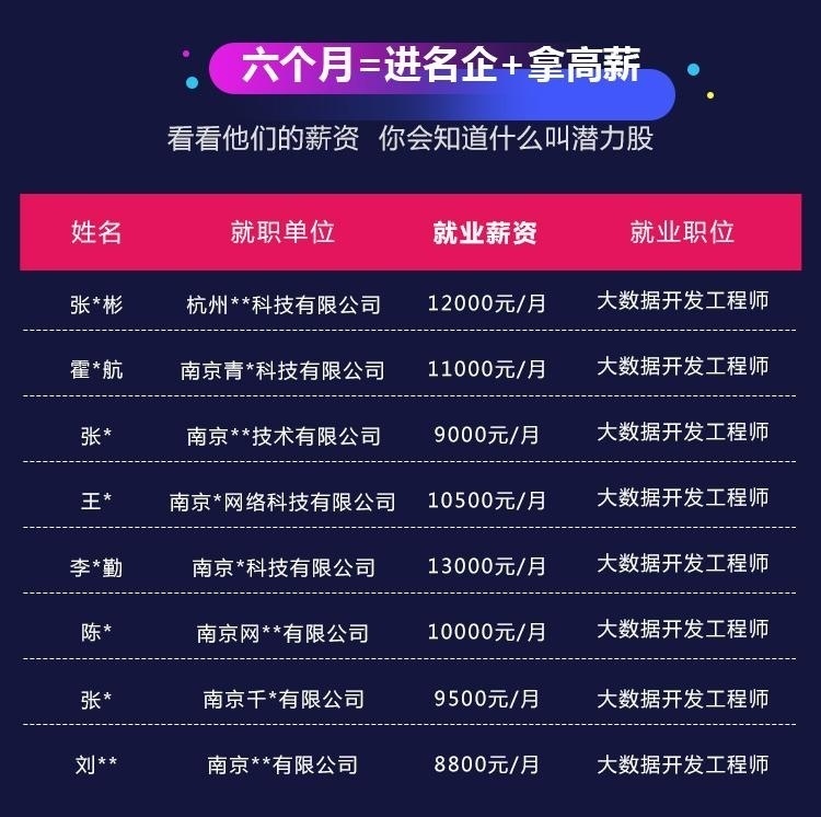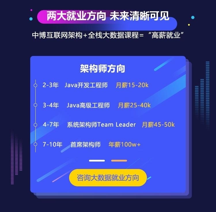 JAVA中级开发工程师(工作2-3年 平均年薪15万)—JAVA高级开发工程师(工作3-5年 平均年薪25万)—大数据应用开发工程师(平均年薪20-30万)—大数据分析师(平均年薪40-60万)—数据专家(平均年薪60-80万)