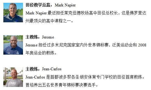 IMG学院的田径学院的教练团队,均由具有多年**水平的比赛和教练经验的专业教练构成。
