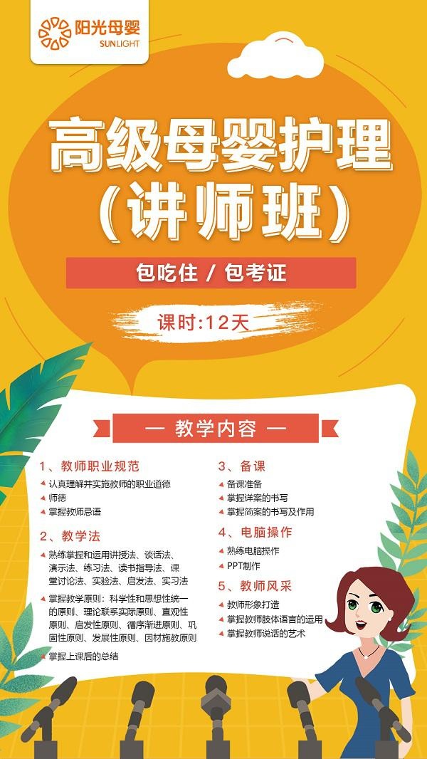 我们在深圳、香港、菲律宾和印尼自设培训中心及办事处,并与多间学校及医疗机构合办训练课程,包括月嫂培训、育婴师培训、产康师培训、催乳师培训、小儿推拿师培训、营养师培训、早教培训、医护培训、护士培训、急救知识培训、语言培训、厨师培训、教师培训、音乐培训等。