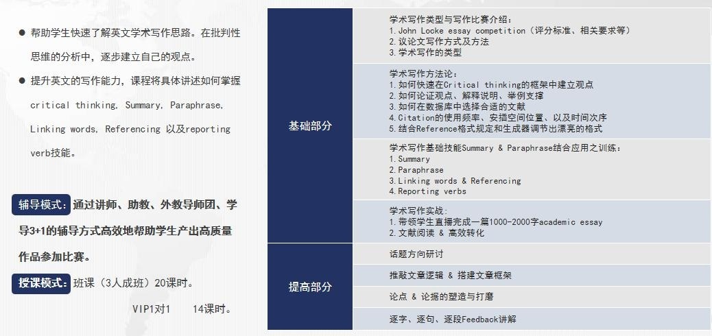 英国牛津大学和美国普林斯顿大学等名校教授合作组织的学术项目竞赛。John Locke Institute是位于英国牛津的独立教育组织,因此,竞赛的评审全部来自英国牛津大学,参赛对象为全世界范围内思考能力**的中学生。在比赛中获得Distinction可以大幅提升美国和英国大学本科申请竞争力。往年参与学生录取成绩包括普林斯顿、哈佛、耶鲁、斯坦福、芝加哥、伯克利、牛津、剑桥等世界名校。