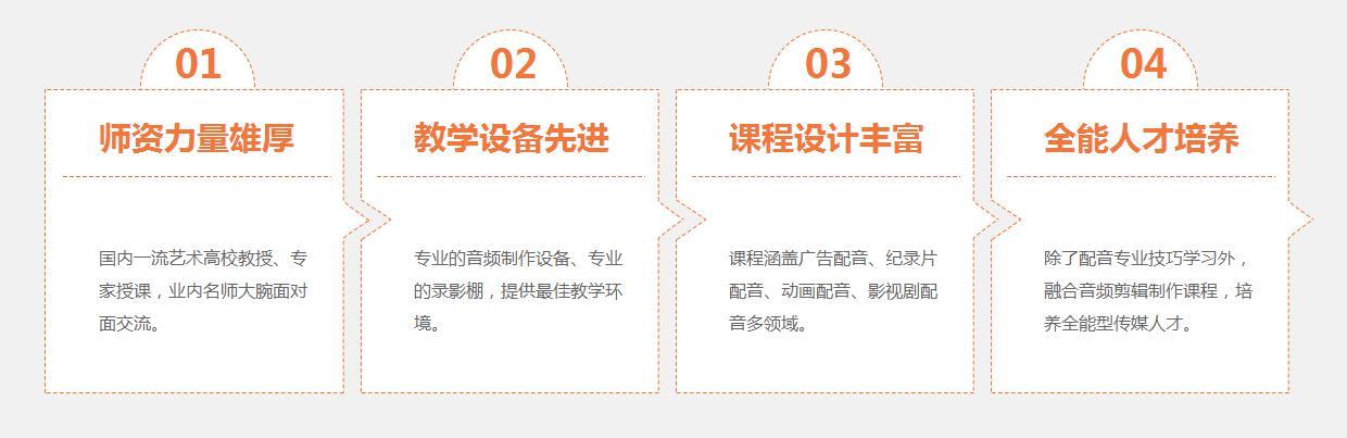 1.配音语言基础:纠正学员普通话发音,为后续作品配音打好基础;2.表演及台词训练:通过表演课程和台词训练,充分发掘学员的语言表现力,解放天性;3.广告配音:通过声音的修饰贴合产品特点,完美呈现广告的效果;4.纪录片与专题片配音:熟练掌握各电视台栏目及专题片配音技巧,力求达到与电视台配音员同等水平甚至更高水平;5.影视剧与动漫配音:培养变声能力和对角色的声音形象把握,通过声音的塑造贴合各类型人物。