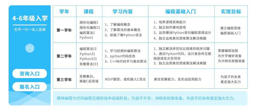 模块编程与代码编程无缝衔接中高级阶段,为孩子升学、冲刺名校做准备,为孩子的未来奠定强大实力。