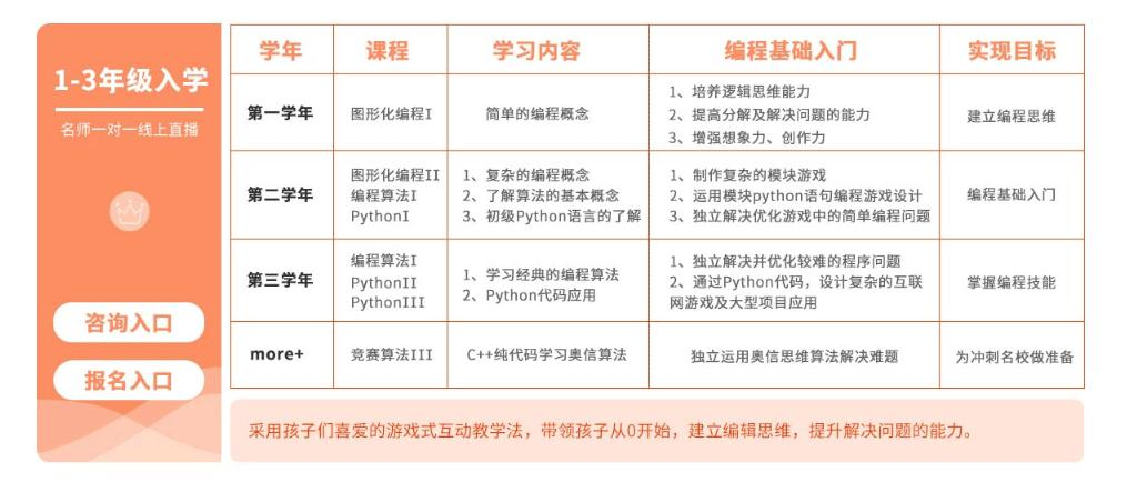 模块化教学模式,结合最能引起学生兴趣的小游戏设计,学习JS ,python, c 等各种程序语言和应用,让孩子在兴趣盎然的环境中学到编程最精深的算法,语法和逻辑。