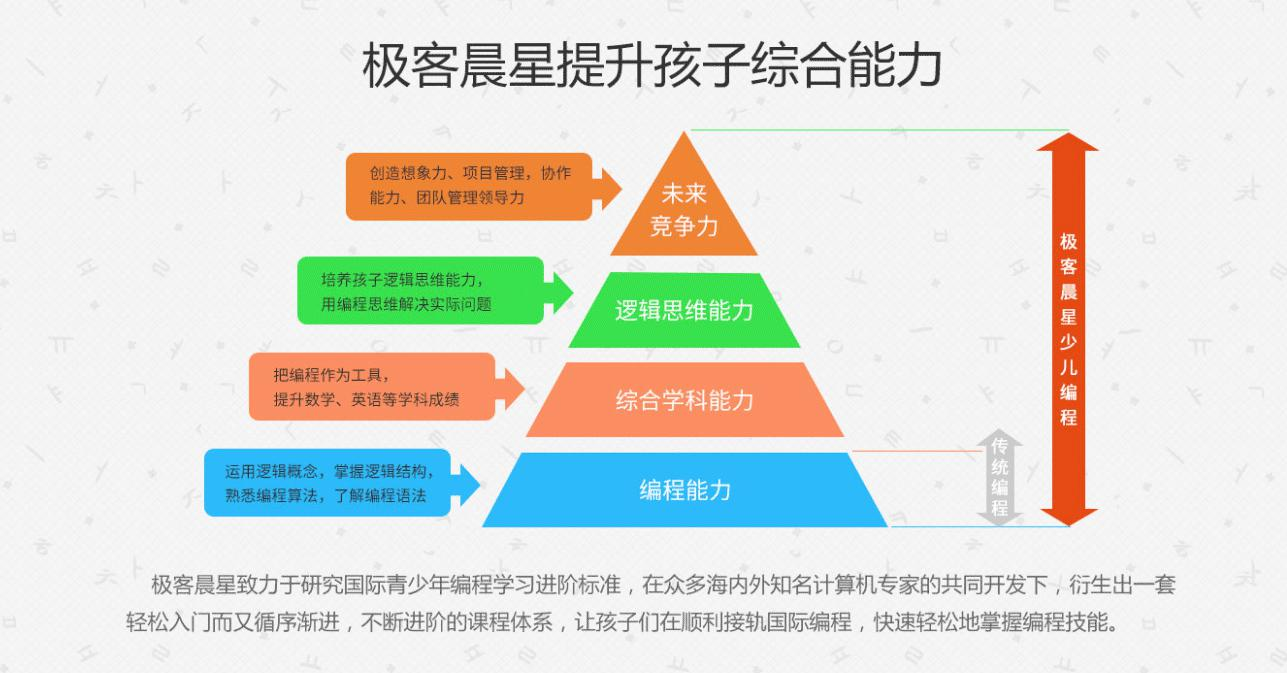 相比市面上其他少儿编程机构的“拿来”主义,极客晨星更愿意花费大量的时间和精力,开发出一套能够从孩子逻辑思维能力入手,更适合中国孩子成长现状的少儿编程课程体系。