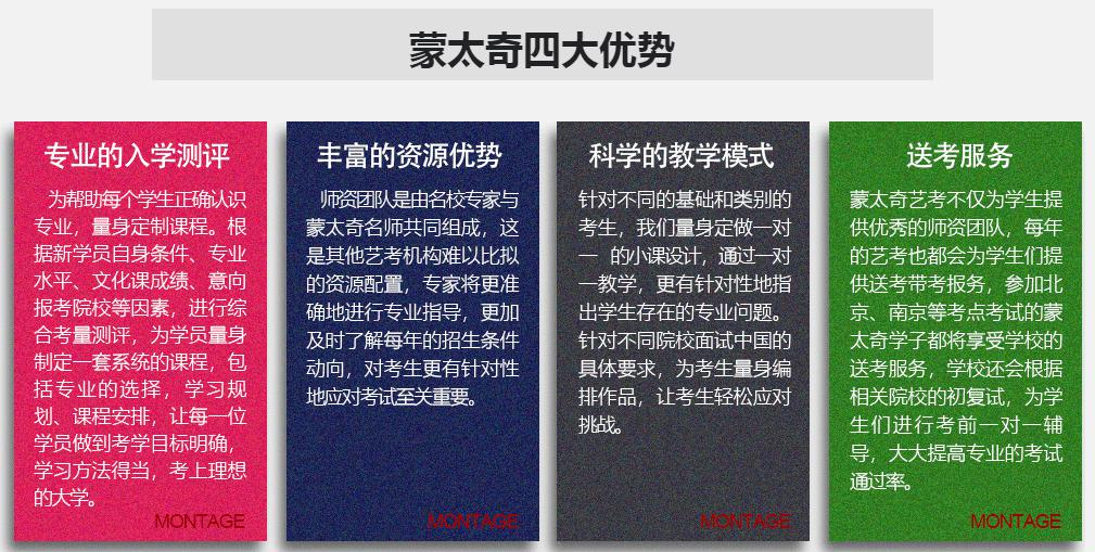 蒙太奇班型:基础班、校考冲刺班、名校班、精讲班、文艺双修班、周末班,这些班型开设的目的是帮忙考生有更多时间的学习。
