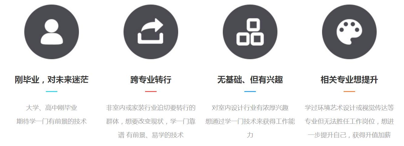 室内设计师培训 入门 AUTOCAD ( 32位,64位)简体中文版,英文版安装3DMAX, VRAY ( 32位,64位)简体中文版,英文版ADOBE PHOTOSHOP CS5/CS6软件。 室内设计理念教程 室内设计理念为开篇重点课程,设计的核心是一种创造行为 ,对于设计师来说创意是设计的灵魂。有一个好的创意我们就需要把它来表现出来。选择手绘或是选择电脑制造。 基础课程 AUTO CAD室内设计基础课程 PHOTOSHOP+CS5,CS6入门到高级 3DSMAX室内设计基础建模及渲染 熟练操控 CAD室内设计中级课程 3DMAX室内建模课程 3DMAX和VRAY室内渲染课程 室内设计手绘课程 高阶项目 CAD室内设计高级课程 VRAY渲染器使用与技巧 VRAY超写实照片级渲染及PS后期处理