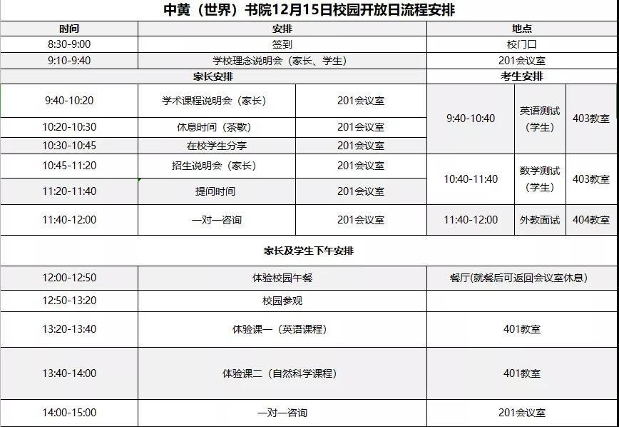 为了让更多的家长和学生深入了解中黄(世界)书院,体验学校的课程设计以及中西合璧的全人教育理念,我校将在12月15日举行校园开放日及入学考试活动,欢迎有志出国的学生、家长前来参加。