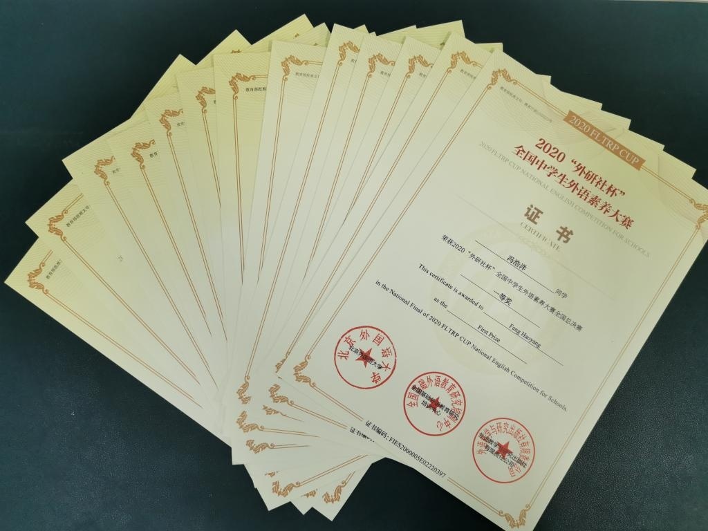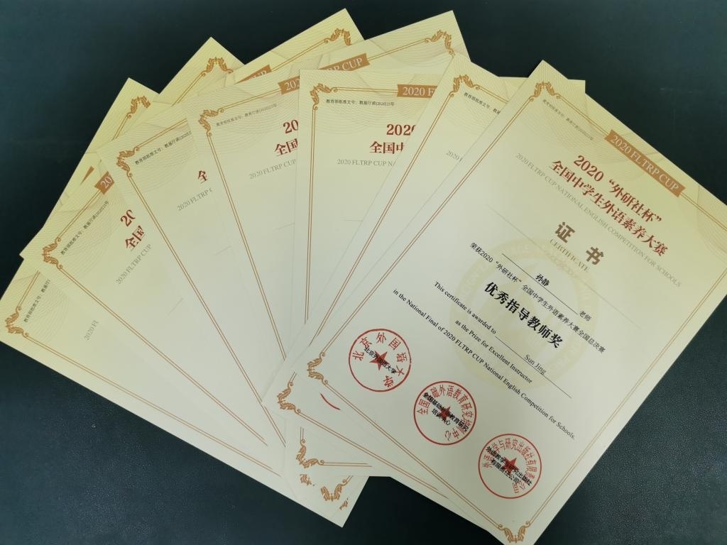 近日,在2020“外研社杯”全国中学生外语素养大赛全国总决赛中,高二1班冯浩洋、高三1班樊睿获一等奖,高二1班许敖溥、刘静怡、张天奥、高三1班杨力宁获二等奖。高中英语教研组孙静、韩笑两位老师获优秀指导教师奖。