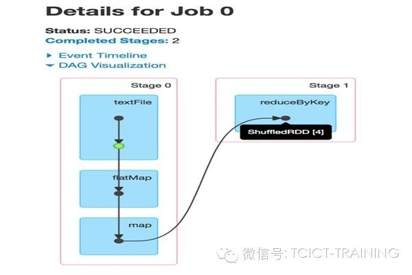 通过可视化我们可以发现很多有价值的地方。首先,根据显示我们可以看出Spark对流水线操作的优化——它们不会被分割。尤其是,从HDF S读取输入分区后,每个executor随后即对相同任务上的partion做flatMap和map,从而避免与下一个stage产生关联。