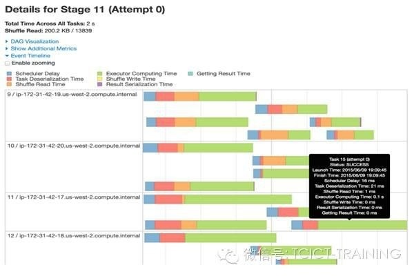在stage视图中,属于这个stage的所有RDDS细节被自动展开。当前,用户可以快速地找到具体的RDDS信息,而不必job页面通过悬停各个点来猜测和检查。