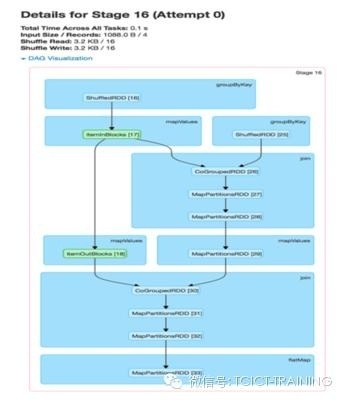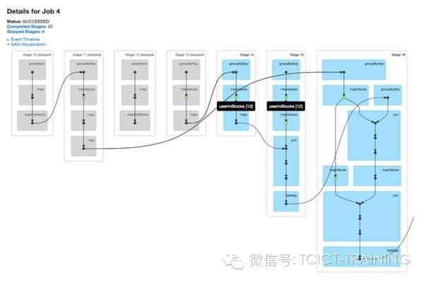 DAG可视化的价值在复杂jobs中体现的尤为明显。比如下图中的ALS计算,它会涉及到大量的map、join、groupByKey操作。