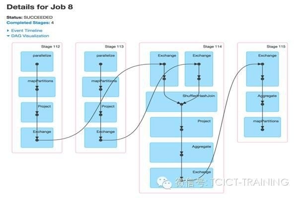 可视化的蓝色阴影框对应到Spark操作,即用户调用的代码。每个框中的点代表对应操作下创建的RDDs。操作本身由每个流入的stages划分。