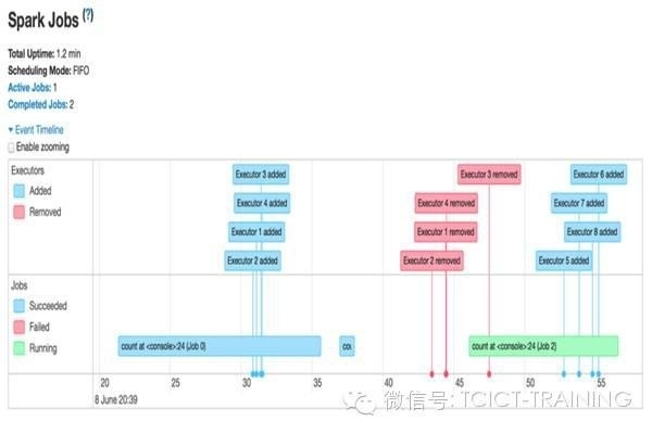 借此机会展示一下Spark通过该时间轴获得的另一个特性——动态分配。该特性允许Spark基于工作负载来动态地衡量executors 的数量,从而让集群资源更有效地共享。不妨看向下张图表: