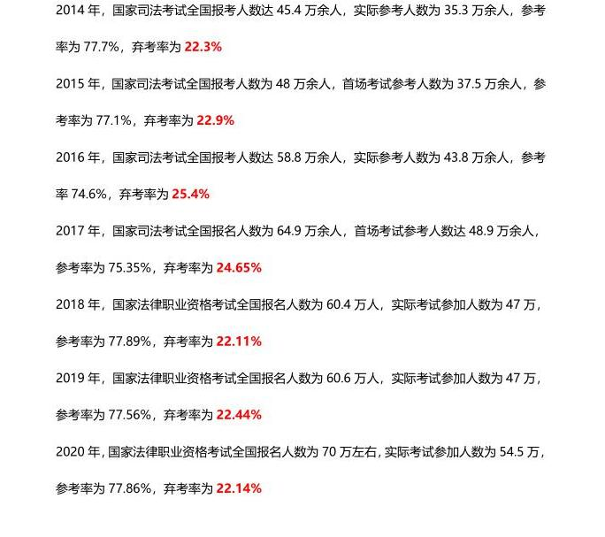 其实纵观历届法考,弃考是非常“普遍”的现象,别看每年有大几十万的考生报考,但实际走上考场的只有75%-80%。