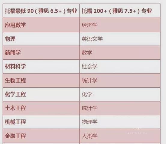 托福最低要求90分的专业比较集中分布在工程学院和科学学院,而对于雅思成绩要求高达7.5的专业主要是文理科专业,很多是理科科目专业,除此之外部分专业的托福成绩最低要求是很高的如金融经济110+,市场营销111分。新闻学院专业对于雅思成绩的要求高达8.0+分。