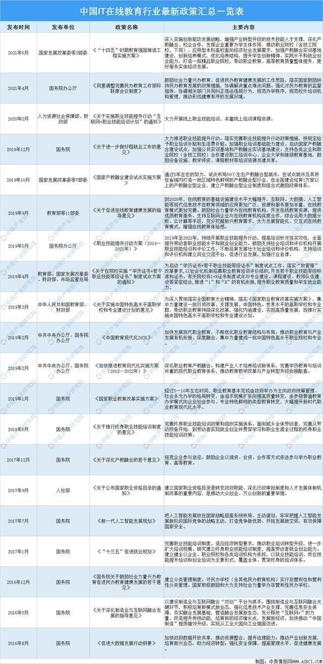 近年来,我国出台了诸多政策促进IT在线教育行业的良性发展,行业内的主要产业政策如下: