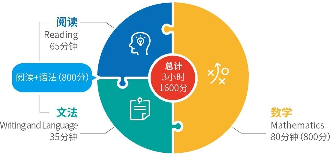 分为两个部分:部分不能使用计算器,25分钟完成20题;第二部分能够使用计算器,55分钟完成38题。考察学生对于基础运算,函数,几何以及数理分析四个板块的知识的掌握。