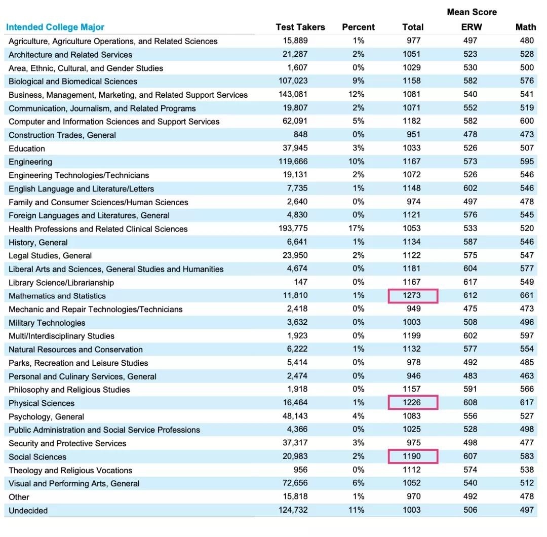 想要冲1500+,数学一定要争取800。对于大部分中国大陆考生来说,数学要拿一个好分数问题不大,阅读语法要拿一个好分数则要好好努力,及早开始规划和进行备考。留意申请专业对SAT分数要求的高低分数平均值最高的三个专业分别为Mathematics and Statistics(数学与统计学)、Physical Sciences(物理科学)、Social Sciences(社会科学),分别为1273、1226、1190,可见这三个专业对于SAT分数的要求是比较高的(所需分数当然不止这个平均数,但平均数在专业列表中偏高说明可能比起其他专业对于SAT分数的要求更高)。因此申请这三个专业的同学要特别重视SAT的备考。申请其他专业的同学也可以参考表中数据合理确定自己的目标分数。