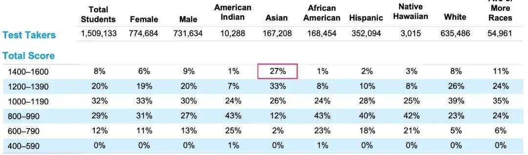 但注意,对于亚洲考生来说,总分位于1400-1600区间的考生占比为27%,这意味着如果一个亚洲考生如果STA考到1400分,那么他/她也只挤进所有亚洲考生的前27%而非8%。因此1500+对于中国大陆考生仍然非常重要,毕竟是要在亚洲考生中脱颖而出。