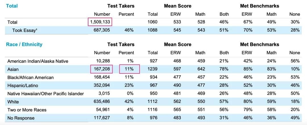 2021年SAT考试总人数为约150万人(1509133人),相比2020年的约219万(2198460人)人少了约70万人。其中,亚洲考生人数为近17万人(167208人),相比2020年的约22万人(223451人)少了约5.6万人(56243人),可以合理推测这个减少有一部分原因是中国大陆考生的减少,毕竟因为疫情缘故,有不少同学难以参加考试。但值得注意的是,亚洲考生占所有考生的比重从2020年的10%升至了2021年的11%,由此可见,对于亚洲考生而言SAT考试成绩仍然有着非常重要的意义。