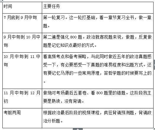 政治蒋中挺和任燕翔老师的书和课程都很好,在这里只简单说一下政治复习分哪几个时间阶段和主要任务,加上今年好像政治变动较大,好让大家对目前还较陌生的政治有一个提纲挈领的把握,具体每个阶段该怎么复习大家可以关注一些老师的微博,老师时常会有答疑。