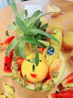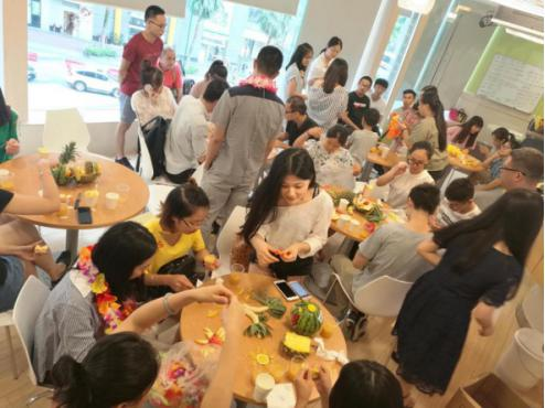 活动开始后,华尔街英语外教Paul首先为学员们介绍夏威夷的地理位置、独特的夏威夷语言以及其他背景知识,与此同时外教Bertie为学员们分发菠萝、西瓜等各种各样的热带水果作为教学道具。华尔街英语疯狂派对个热身活动是Fruit carving contest。外教邀请大家运用各种各样的水果组合成一幅美丽的雕塑图画,大家充分发挥想象力,对脑海中的完美雕塑进行创造。华尔街英语的学员们呈现出种种纷丽有趣、独特造型的作品,连外教都连连称赞:学员们的创意真是了不起!不要以为华尔街英语的外教老师在学员动手表达作品时只会点赞,给你露两手瞧瞧!外教Paul现场制作分发给学员们正宗夏威夷风味的Hawaii鸡尾酒,口感微甜且带有橙香,好喝到学员们都不愿意放下杯子。