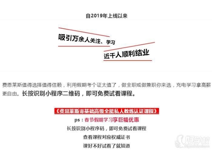 费恩莱斯,是英语“Fearless”的音译。意思是“无所畏惧”。我们致力于健身培训事业,以专业而著称;以荣誉而闻名;乐道于每个学员的成功!学院实力雄厚,在北京建有功能完善的培训和训练基地,并制定了长远的发展规划,学园坐拥超大训练基地,学习训练一律采用欧洲进口的健身器械。每期学员都在独立的多功能教室授课,配备的导师,为您制定科学的学习和训练计划。为每个有梦想的学员提供贴心的服务。