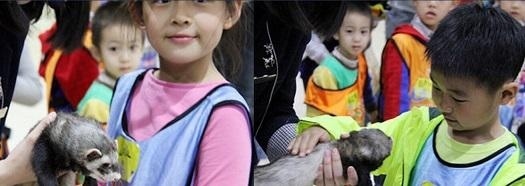 活动进行中孩子们迎来了一位神秘嘉宾林鼬,林鼬是56种鼬科动物中的一种,和我们俗称的黄鼠狼(黄鼬)是近亲。林鼬的特点是身体细长灵巧,尾和四肢较短,足上有五根弯的、无法收入的爪。林鼬陪伴人类的历史很悠久,文艺复兴时期一位非常有名的艺术家达芬奇有一副著名的画作:《抱银鼠的女人》画作里面的银鼠就是一只林鼬,达芬奇是1519年去世的,所以林鼬陪伴人类的历史至少有500年了。孩子们在听完老师的讲解后有机会和小林鼬来一次亲密接触,轮流小心地抚摸它的皮毛,近距离感受它的灵巧可爱。