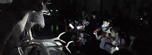 终于到了最紧张刺激的环节-夜探博物馆。关了灯的展厅漆黑一片,里面有哪些动物在等着我们也是未知。同学们戴上头灯或举着手电筒,变身小冒险家,开始真正的探索。不知是不是因为夜晚宁静的缘故,每一个动物都好似活着一般,与我们对视,聆听孩子们的窃窃私语。我们探访了白唇鹿、雪豹、孟加拉虎、黑熊、盘羊、狼等许多难得一见的动物。同学们都暗自寻找自己今晚的动物邻居,决心盯着这些朋友,不放过他们可能活过来的蛛丝马迹。