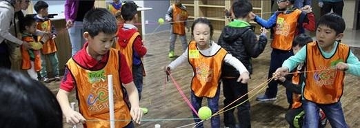 作为探险前的热身,同学们进行了团队破冰游戏“幸运小苹果”和“十二绳笑”。十二绳笑需要多人合作,平稳移动,将目标设定为“企鹅宝宝”的小球运送到指定地点。这是一个具有难度的挑战任务,在不断地重复失败与重来的过程中,同学们一次次完善各组的操作方法和团队的专注度,最终成功将“企鹅宝宝”送回家。