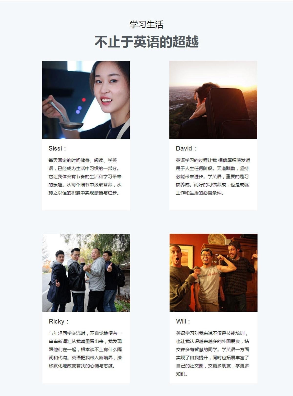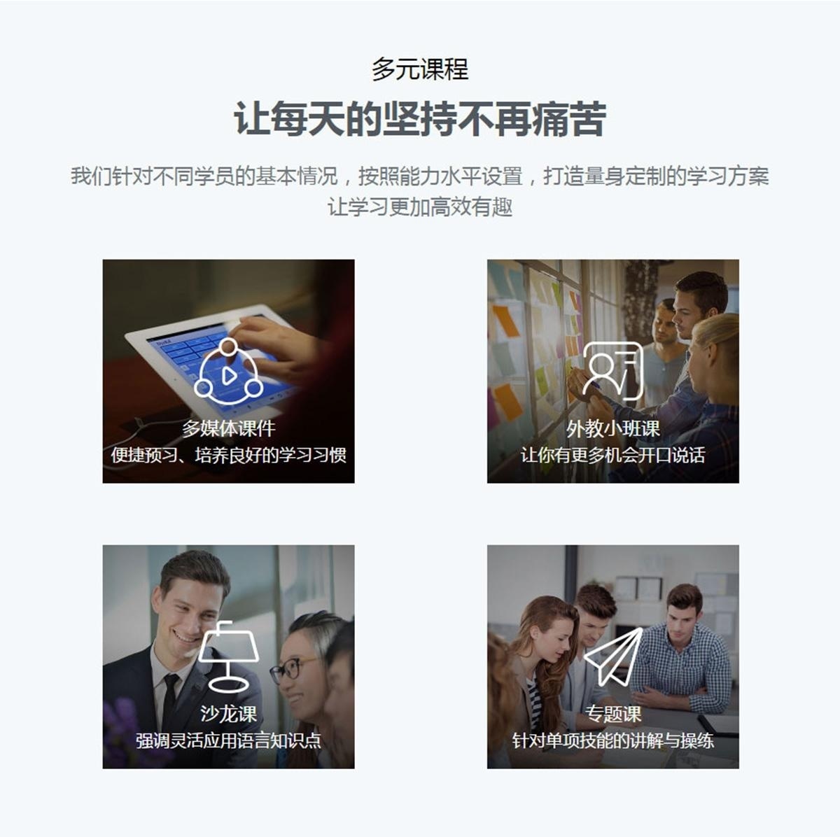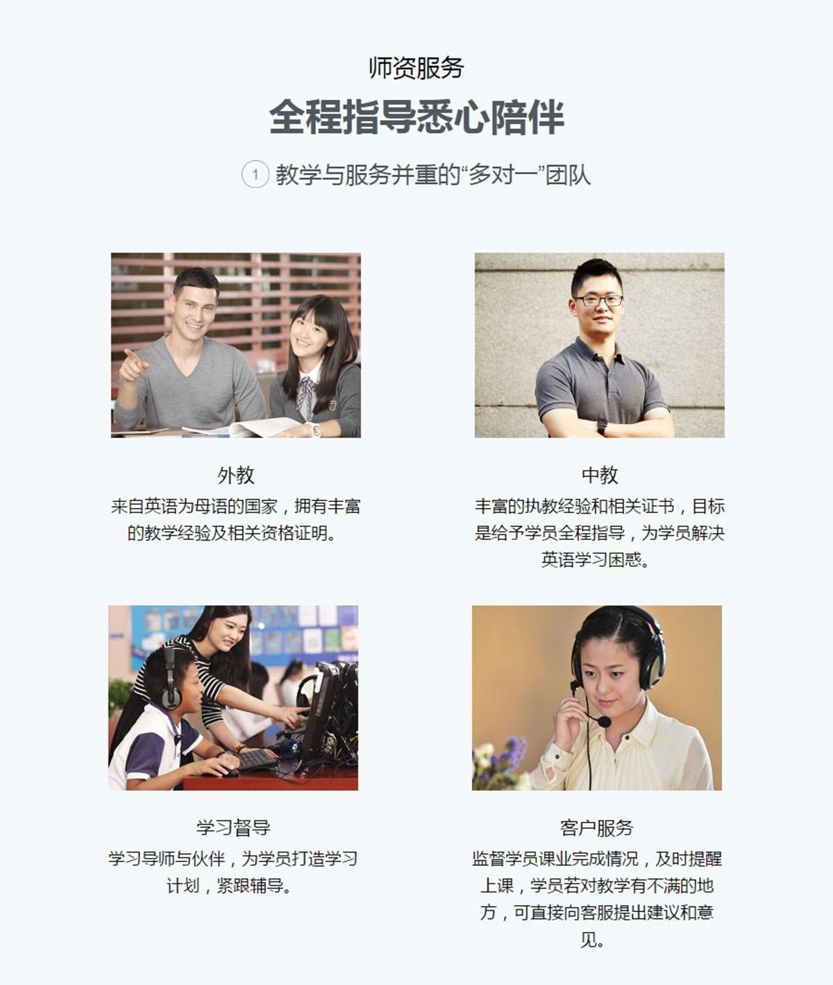外教:来自英语为母语的国家,拥有丰富的教学经验及相关资格证明。中教:丰富的执教经验和相关证书,目标是给予学员全程指导,为学员解决英语学习困惑。学习督导:学习导师与伙伴,为学员打造学习计划,紧跟辅导。客户服务:监督学员课业完成情况,及时提醒上课,学员若对教学有不满的地方,可直接向客服提出建议和意见。