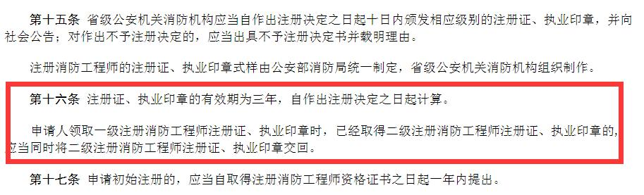 公安部143号令:更明确了一级消防工程师、二级消防工程师地位;注册证、执业印章的有效期为三年,自作出注册决定之日起计算;且不得同时在两个以上消防技术服务机构,或者消防安全重点单位执业;更是印证了二级消防工程师的重要性;