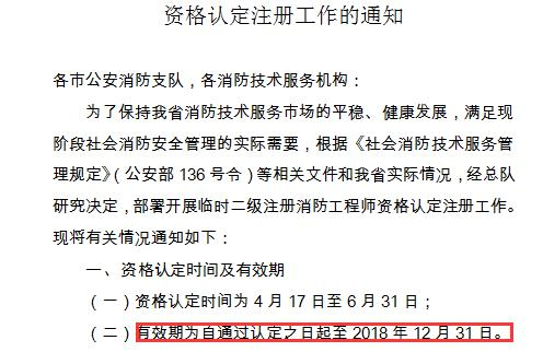 前期辽宁消防网曾发布重磅消息:《关于开展临时二级注册消防工程师资格认定注册工作的通知》;然而临时二级消防证书有效期却仅仅只有一半年左右的时间,国家开展一次认定证书;这些足以证明:临时二级证书只是过渡性措施。