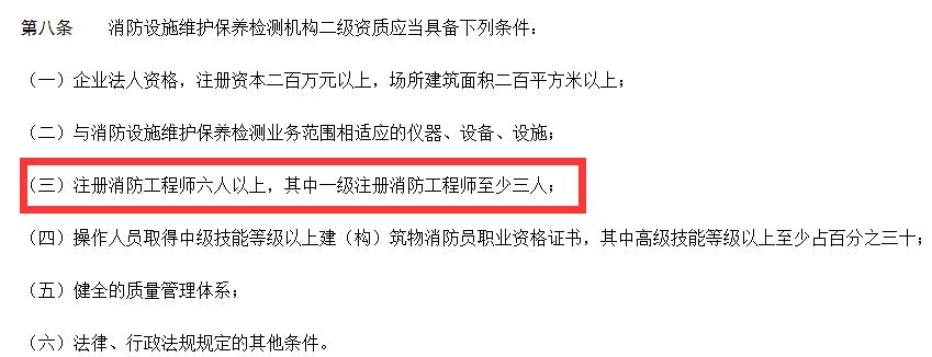 公安部129号令: 要求注册消防工程师六人以上,其中一级注册消防工程师至少三人,可见给二级消防工程师考试埋下了伏笔;