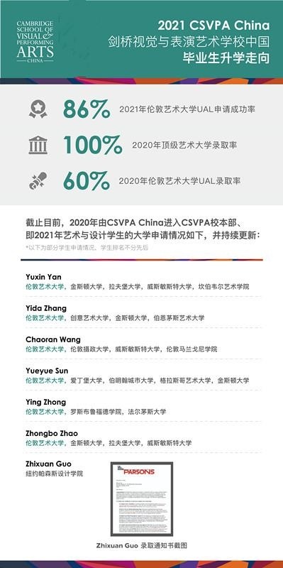 剑桥艺术中国(CSVPA China )2021最新来啦!虽然面临全球疫情的挑战,但是我们剑桥艺术中国毕业生不负众望,目前已经达到86%伦艺UAL申请成功率!