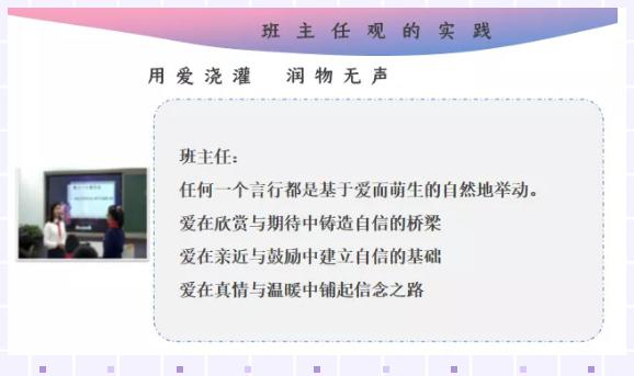 她指出:班主任任何一个言行都是基于爱而萌生的自然地举动。爱在欣赏与期待中铸造自信的桥梁;爱在亲近与鼓励中建立自信的基础;爱在真情与温暖中铺起信念之路。在活动中,她也分享到,班主任工作中要更多地投入爱,引导学生树立远大理想和近期目标,更要熏陶感恩和责任意识。而她,也正是这样践行着作为一名励志型班主任的诺言。