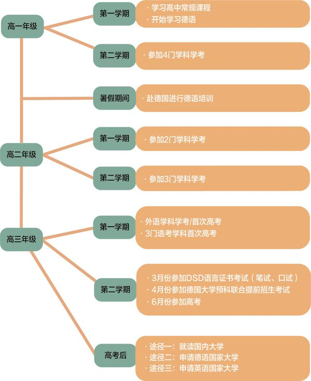 学生将在高中三年学习国内高中课程、DSD德语课程并参加德国国外学校教育司和上海领事馆组织的游学以及各级各类德语赛事及活动。