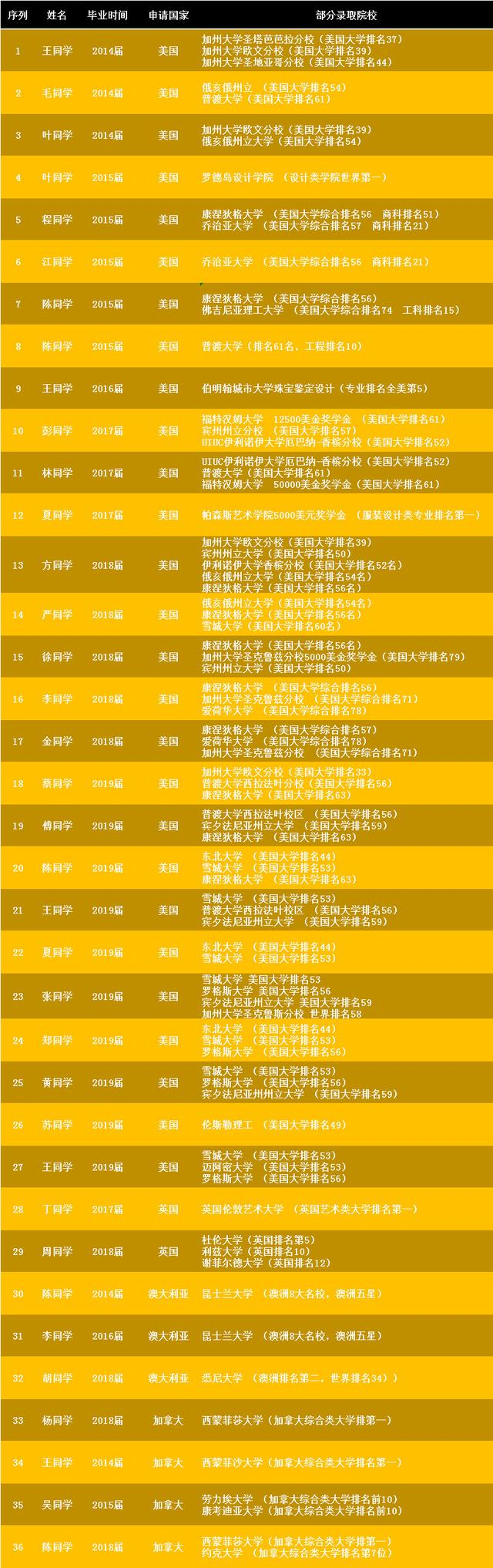 绿城育华学校自2014年至今,留美学生100%被美国专业排名前100的名校录取。下图是往届中美课程项目录取情况: